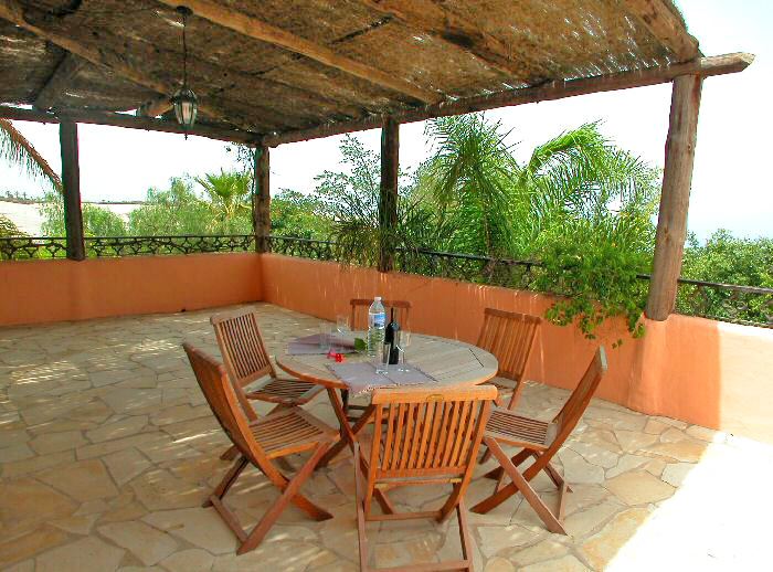 teilüberdachte Terrasse mit Gartenmöbeln
