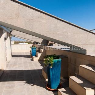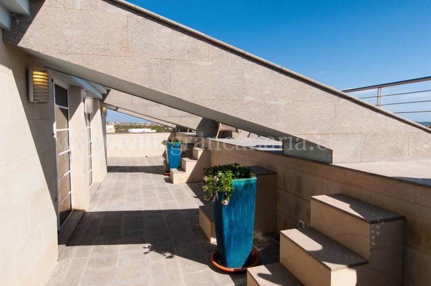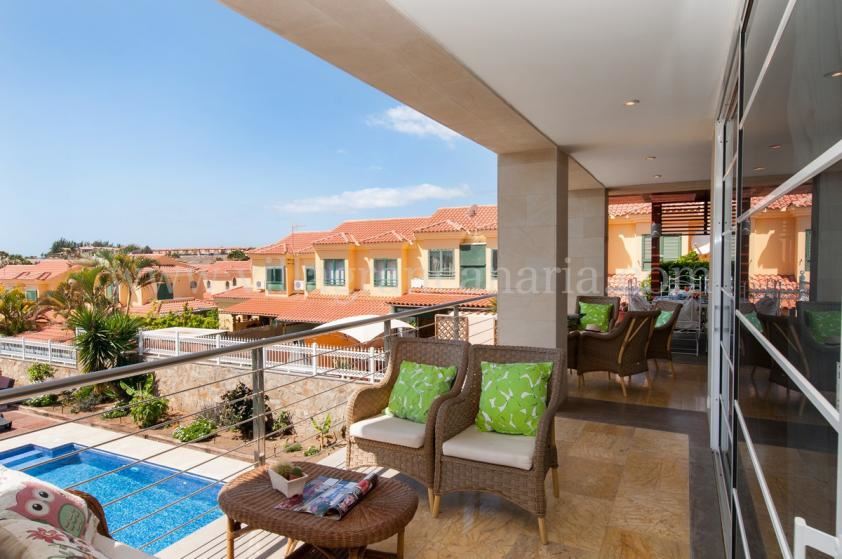 Terrasse mit Gartenmöbeln und Liegen und Balkon