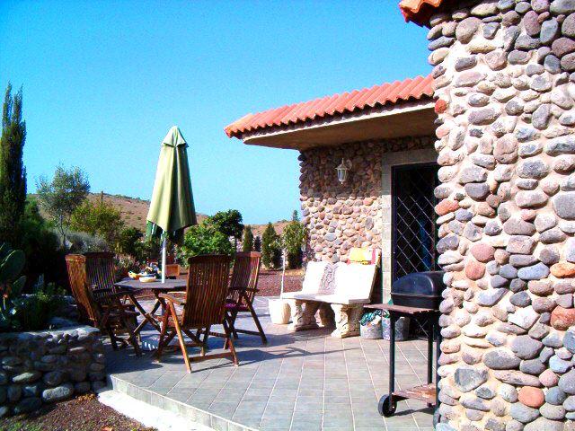 Die charmante Casa mit Blick bis zum Meer liegt in traumhafter Hanglage an der Südküste von Gran Canaria. Vom gemütlich, rustikal eingerichteten, Wohnzimmer gelangt man über eine Glasschiebetür auf die großzügige Terrasse. Hier kann man den atemberaubenden Weitblick auf die Umgebung und die Ausläufer der touristischen Gebiete von Gran Canaria genießen. Familien oder Paare können in diesem behaglich, mit dunklen Holz möblierten Landhaus im Stil der 70/80 ziger Jahre, einen unbeschwerten Urlaub verbringen.