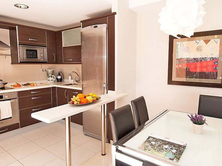 angrenzende offene Küche mit Cerankochfeld (4 Platten), Kaffeemaschine, Toaster, Geschirrspüler, Kühlschrank, Mikrowelle