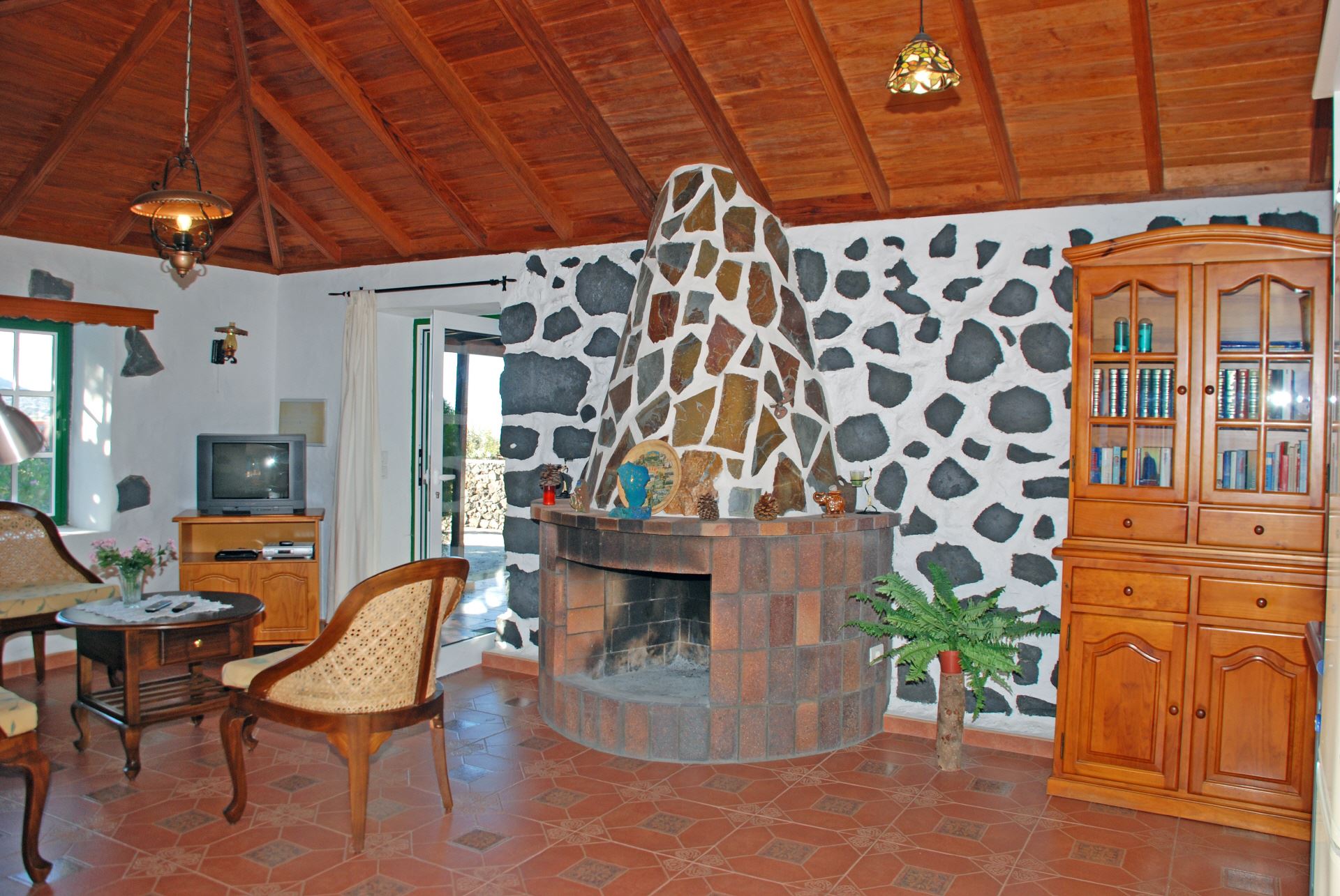 Wohnzimmer mit Bambussofa und Natursteinkamin, zusätzlicher Gasofen, SAT-TV, CD Spieler
