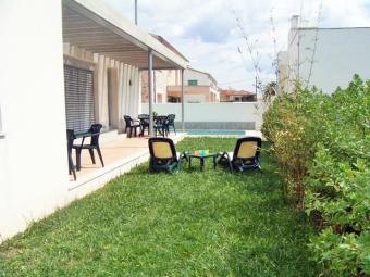 überdachte Terrasse mit Gartenmöbeln und Liegen