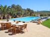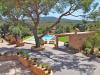 mehrere teilweise überdachte Terrassen mit Gartenmöbeln und Liegen