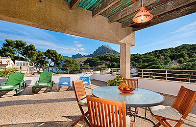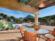 große, teilweise überdachte Terrasse mit Gartenmöbeln und Liegen